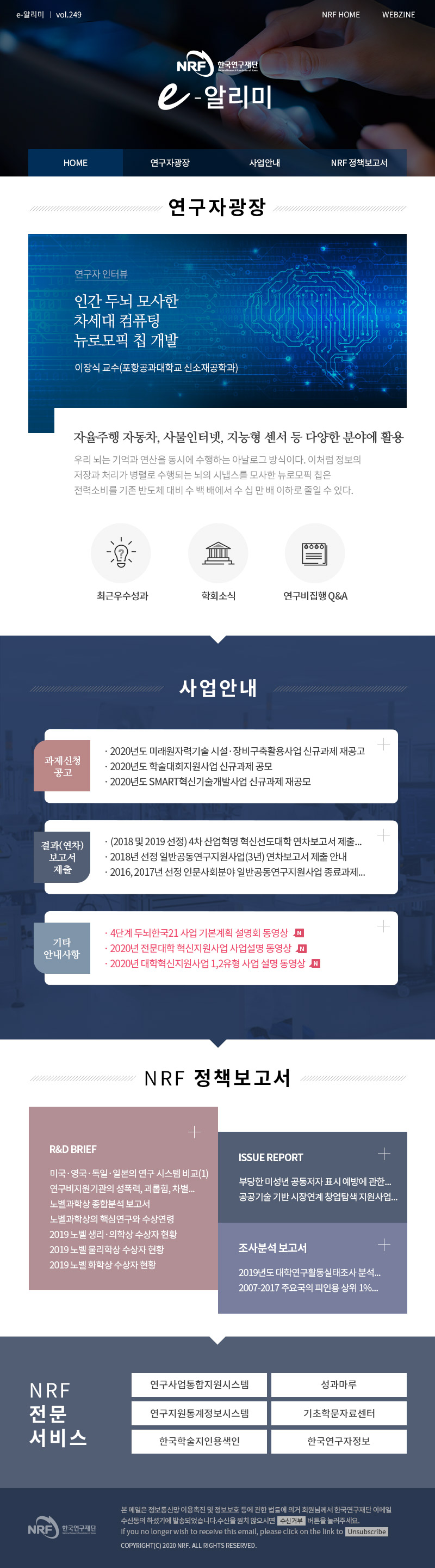 e알리미 vol.249 NRF HOME WEBZINE HOME 연구자광장 사업안내 NRF 정책보고서 연구자인터뷰 인간 두뇌 모사한 차세대 컴퓨팅 뉴로모픽 칩 개발 최근우수성과 학회소 연구비집행Q&A 과제신청공고 더보기 2020년 미래원자력기술 시설 · 장비 구축활용사업 신규과제 재공고 2020년도 학술대회지원사업 신규과제 공모 2020년도 SMART혁신기술개발사업 신규과제 재공모 결과보고서제출 더보기 (2018 및 2019 선정) 4차 산업혁명 혁신선도대학 연차보고서 제출 요청 2018년 선정 일반공동연구지원사업(3년) 연차보고서 제출 안내 2016, 2017년 선정 인문사회분야 일반공동연구지원사업 종료과제 결과보고서 제출 안내(2019년 10월 종료) 기타안내사항 더보기 4단계 두뇌한국21 사업 기본계획 설명회 동영상 2020년 전문대학 혁신지원사업 사업설명 2020년 대학혁신지원사업 1, 2유형 사업 설명 동영상 R&D BRIEF 더보기 미국·영국·독일·일본의 연구 시스템 비교 (1) - 생명과학·생물의학 분야 연구자금 연구비지원기관의 성폭력, 괴롭힘, 차별 노벨과학상 종합분석 보고서 노벨과학상의 핵심연구와 수상연령 2019 노벨 생리·의학상 수상자 현황 2019 노벨 물리학상 수상자 현황 2019 노벨 화학상 수상자 현황 ISSUE REPORT 더보기 부당한 미성년 공동저자 표시 예방에 관한 연구 공공기술 기반 시장연계 창업탐색 지원사업(한국형 아이코어 사업) 성과분석 조사분석보고서 더보기 2019년도 대학연구활동실태조사 분석 2007-2017 주요국의 피인용 상위 1% 논문실적 비교분석 보고서 연구사업통합지원시스템 성과마루 연구지원통계정보시스템 기초학문자료센터 한국학술지인용색인 한국연구자정보 수신거부 Unsubscribe