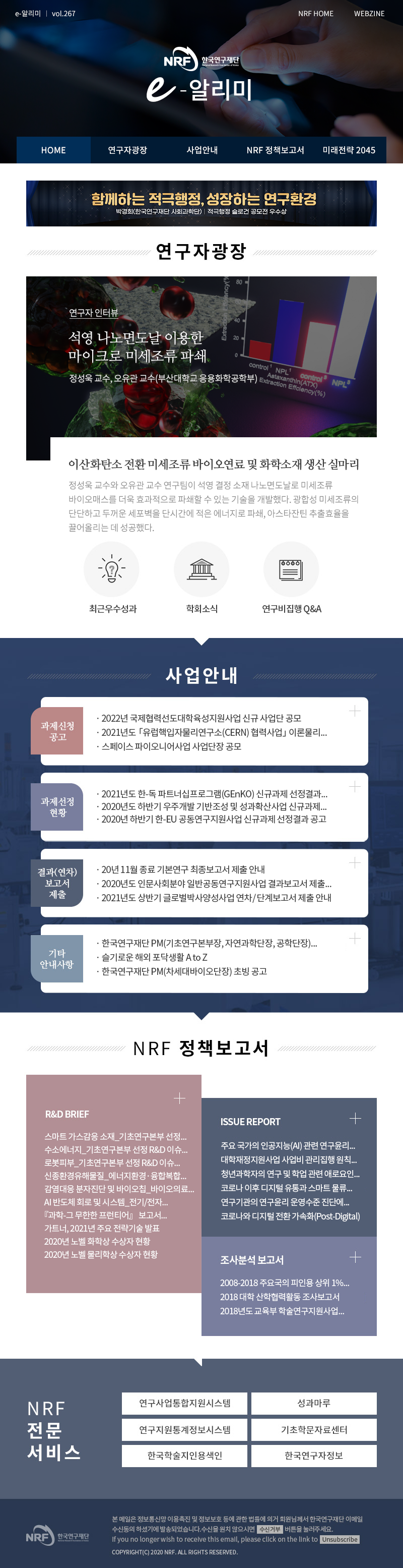 e알리미 vol.267 NRF HOME WEBZINE HOME 연구자광장 사업안내 NRF 정책보고서 미래전략 2045 염기교정 유전자가위의 안전성 높일 실마리 찾아 김형범 교수(연세대학교 의과대학 약리학교실) 최근우수성과 학회소 연구비집행Q&A 과제신청공고 더보기 2022년 국제협력선도대학육성지원사업 신규 사업단 공모 2021년도「유럽핵입자물리연구소(CERN) 협력사업」 이론물리 공동연구 대학원생 파견 공고 스페이스 파이오니어사업 사업단장 공모 과제선정현황 더보기 2021년도 한-독 파트너십프로그램(GEnKO) 신규과제 선정결과 공고 2020년도 하반기 우주개발 기반조성 및 성과확산사업 신규과제 선정결과 공고 2020년 하반기 한-EU 공동연구지원사업 신규과제 선정결과 공고 결과보고서제출 더보기 20년 11월 종료 기본연구 최종보고서 제출 안내 2021년도 상반기 글로벌박사양성사업 연차/단계보고서 제출 안내(수정) 20년 11월 종료 기본연구 최종보고서 제출 안내 기타안내사항 더보기 2020산학협력 엑스포 온라인 개최 안내 부정청탁에 대한 대응 매뉴얼 한국연구재단 소관 국가 R&D 사업의 연구개발성과 실시에 따른 기술료 보고 의무 안내 R&D BRIEF 더보기 ISSUE REPORT 더보기 연구기관의 연구윤리 운영수준 진단에 관한 연구 [이슈리포트 2020-14호] 코로나와 디지털 전환 가속화(Post-Digital) 코로나19 현상에 대한 인문학적 성찰(Ⅰ), (Ⅱ) [이슈리포트 2020-12호] 연구논문의 사사(謝辭) 표기 정책에 관한 연구 디지털화와 정부의 역할 변화 2020년 대학 교원의 연구윤리 인식수준 조사에 관한 연구 조사분석보고서 더보기 2008-2018 주요국의 피인용 상위 1% 논문실적 비교분석 보고서 2018 대학 산학협력활동 조사보고서 2018년도 교육부 학술연구지원사업 성과분석보고서 연구사업통합지원시스템 성과마루 연구지원통계정보시스템 기초학문자료센터 한국학술지인용색인 한국연구자정보 수신거부 Unsubscribe