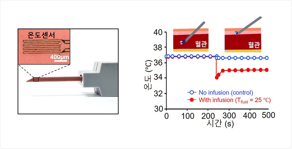 환자와 의료진 모두를 위한 정 교수의 아이디어는 여기서 멈추지 않았는데요. 정맥 주사 중 잘못된 주사바늘 위치로 인해 약물이 주변 조직으로 유출될 경우 발생하는 부작용을 막기 위한 기술을 개발합니다. 약물이 유출될 때 주위 조직의 온도가 낮아지는 현상을 이용해 나노박막 온도 센서를 개발, 이를 정맥 주사바늘에 탑재해 국부 체온의 변화를 점검하는 기능을 구현했습니다. 동 기술로 의료진은 정맥주사 중 약물의 누수를 실시간으로 확인할 수 있게 되었죠.