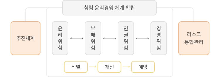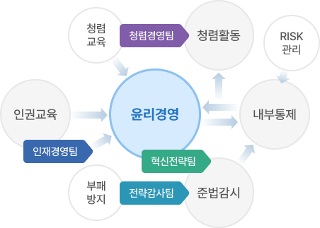 기관장 직속 기획조정본부 내 전담부서인 윤리경영팀을 신설하여 윤리·청렴·내부통제·인권업무 통합 추진 및 실행력 제고를 위한 거버넌스를 확립했습니다. 이를 통해 업무 중복과 혼선을 최소화하고 기재부, 권익위, 감사원 등 유관기관의 여러 규제와 준법 요구사항에 통합적으로 대응하여, 준법·윤리경영 추진에 있어 실효성과 전문성을 한 층 강화하였습니다.