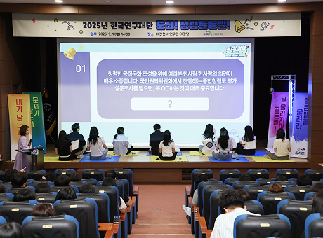 지난 9월 1일, 대전 청사 연구관 대강당에서 ‘도전 청렴 골든벨’ 행사가 진행(서울 청사 8월)되었습니다. 골든벨에 지원한 직원들은 청렴을 주제로 한 여러 퀴즈를 풀면서, 마음속에 품고 있던 청렴 의지를 드러냈는데요. 평소 업무를 진행하면서 마주하는 청렴 상황을 퀴즈로 접하며 다시금 윤리의식을 되새겼죠. 치열한 접전 끝 최후의 10인에 선정된 직원은 대강당 단상에서 청렴 지식을 겨루는 모습을 보였습니다. 이날의 뜨거운 열기는 청렴이 멀리 있는 가치가 아닌, 우리 모두의 일상 속 실천이라는 메시지를 전했습니다.
