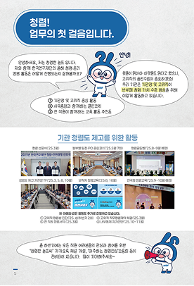 지난 8월, 재단은 기관 최초로 청렴·윤리경영 가이드북 「마주하는 청렴진심」을 제작·배포했습니다. 대표 캐릭터 ‘늘프’가 등장해 업무의 첫걸음이라 할 수 있는 청렴의 기본부터 사례 중심 실천 방법까지 안내하는 내용으로 꾸려졌는데요. 가이드북에는 올해 추진된 재단의 청렴·윤리경영 활동을 한눈에 짚어보고 갑질 예방 행동 규범, 안심변호사 제도 FAQ, 종합청렴도 및 고객만족도 교육 등 실무에 도움이 되는 정보를 풍부하게 담았습니다. 누구나 쉽게 읽고, 자연스럽게 실천할 수 있는 청렴의 기준을 공유하고 있죠. 이번 가이드북은 재단 내 소통과 신뢰를 바탕으로 하는 건전한 조직문화를 구축하는 밑거름이 될 것으로 보입니다.