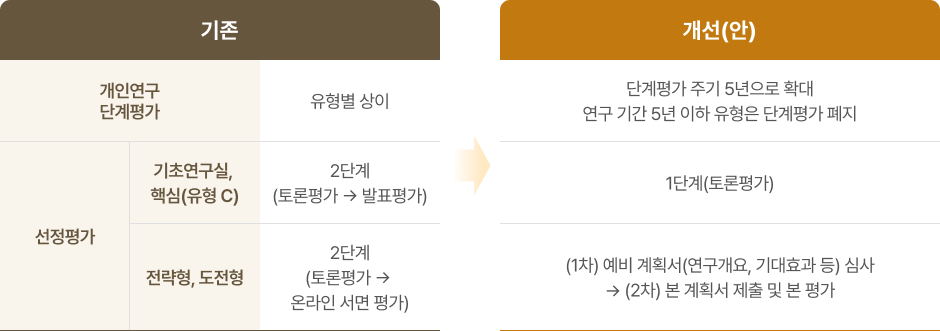 연구자들이 창의적 연구에 몰입하고 장기적으로 안정적인 연구 활동을 이어갈 수 있도록, 2026년 개인연구 신규과제부터 단계평가 주기를 5년으로 확대합니다. 이에 따라 리더연구의 단계평가는 기존 2회에서 1회(5+4년)로 줄어들며, 연구 기간이 5년을 초과하는 일부 유형을 제외한 대부분의 과제에서는 단계평가가 폐지되죠. 선정평가도 평가 절차를 축소하고, 연구개발계획서 분량·양식도 간소화해 연구자들의 부담을 완화할 예정입니다. 이와 함께 평가위원 개별 점수제 및 전문 영역별 평가를 도입하고, 전문평가단 규모 및 검토위원회(RB, Review Board) 분야를 점진적으로 확대하는 등 평가의 신뢰도와 질적 수준을 높여갈 계획입니다.