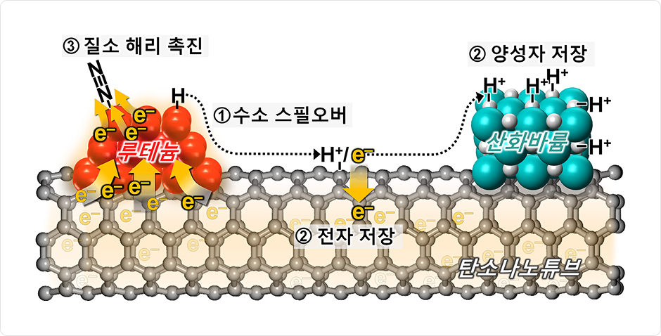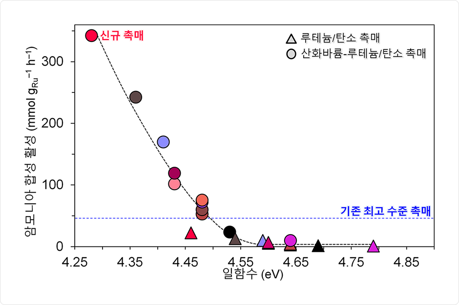 ① 암모니아 합성 반응 중 생성된 수소 원자(H) → 수소이온(H⁺)과 전자(e⁻)로 분리연구팀은 신개념 촉매 메커니즘을 바탕으로, 전도성 탄소 지지체의 나노 구조와 일함수*를 정밀하게 제어했습니다. 그 결과 300℃와 10기압이라는 온건한 조건에서도 기존 최고 수준 촉매 대비 7배 이상 높은 암모니아 합성 성능을 달성했습니다. 저온·저압 조건에서 실질적으로 활용할 수 있는 촉매 성능을 확보해 기존 하버-보슈 공정을 대체할 수 있는 친환경 암모니아 생산 기술의 가능성을 찾아낸 셈이죠. 수소 경제 실현과 탄소중립 달성이라는 중대한 목표 앞에 서 있는 현시점에서 핵심적인 연구성과를 도출했다는 평가를 받고 있습니다.
