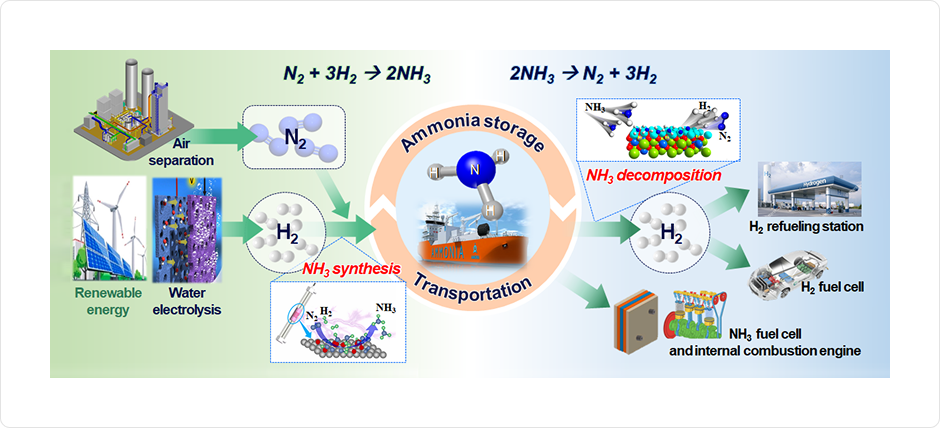기초과학의 세계에 푹 빠진 그는 화학 현상을 깊이 있게 분석하고, 이론적으로 해석하며 내공을 쌓았습니다. 탄탄한 기본기 위에 선 최민기 교수는 기초 과학적 이해와 화학공학을 이어 촉매 연구에 본격적으로 뛰어듭니다. 촉매는 화학 반응을 빠르고 효율적으로 일어나도록 돕는 물질로, 현대 화학 산업에서 중요한 역할을 하는 물질인데요. 그가 가장 먼저 배운 촉매 반응은 하버-보슈 공정으로, 공기 중의 질소(N2)와 수소(H2)를 반응시켜 암모니아(NH3)를 합성하는 기술입니다. 암모니아가 특별한 이유는 이러합니다. 비료와 의약품 등의 핵심 원료일 뿐 아니라 수소 저장 밀도가 높은 덕에 장기 저장과 장거리 운송이 가능한 차세대 에너지 매개체로 주목받고 있다는 것. 하지만 하버-보슈 공정은 500℃ 이상의 고온과 100기압 이상의 고압이라는 두 조건을 충족해야만 암모니아를 합성할 수 있다는 까다로운 한계가 있었죠. 합성 과정에서 막대한 에너지가 소비되고, 이산화탄소를 배출해 환경에 상흔을 남긴다는 문제도 있었습니다. 최 교수 연구팀은 이러한 한계를 극복하기 위해 하버-보슈 공정에 용감한 물음표를 던지게 됩니다. “흥미로운 점은 하버-보슈 공정이 개발된 지 100년이 지난 지금도, 당시 촉매와 공정을 거의 그대로 사용한다는 사실입니다. 개선 여지가 없어서라기보다는, ‘완성된 기술'이라는 인식에 후속연구가 부족했기 때문이 아닐까 해요. 여전히 규명되지 않은 부분이 많고, 그린 암모니아 생산 등 후속연구의 파급력도 크다고 생각했습니다.”