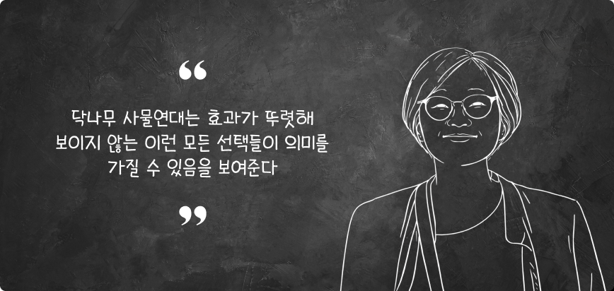 어느덧 연말입니다. 아직 이 책을 읽지 않은 독자에게 딱 한 문장에만 밑줄을 그어 선물할 수 있다면 어떤 문장일까요?“닥나무 사물연대는 효과가 뚜렷해 보이지 않는 이런 모든 선택들이 의미를 가질 수 있음을 보여준다.”는 마지막 쪽의 문장입니다. 내가 하는 작은 일에서 효능감을 느끼기는 사실 힘듭니다. 그래서 스스로가 하는 선택의 힘을 부정하기도 하고, 무력감을 느끼는 경우가 많은 것 같습니다. 장인들의 선택은 외롭기만 한 독단이 아닌 사물과 더불어 발휘되는 기지였습니다. 이렇게 주변의 사물이 건네는 말을 먼저 듣고 친밀해지면서 일의 즐거움과 의미가 동시에 전달되면 좋겠습니다.