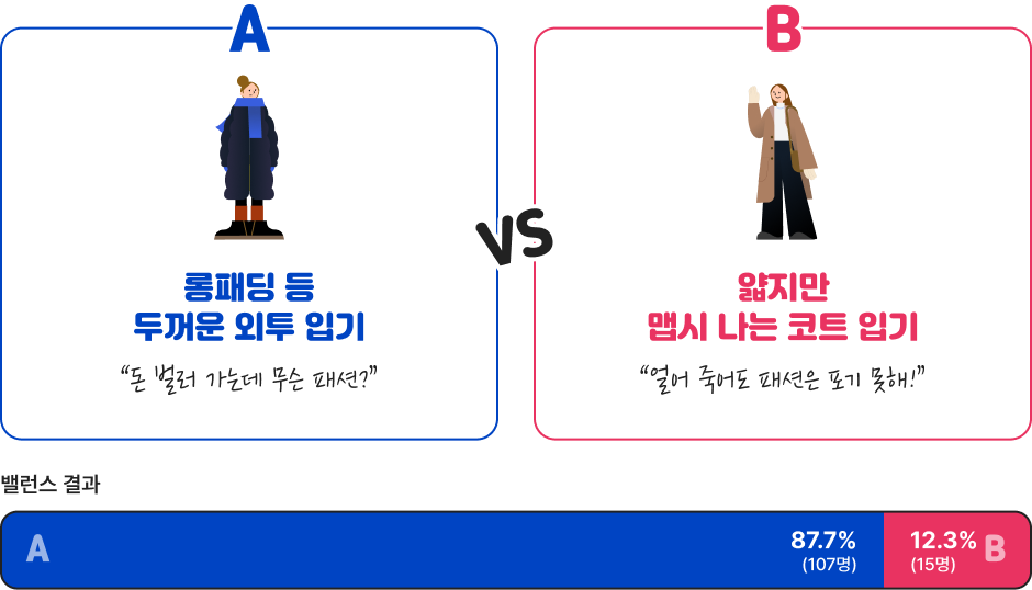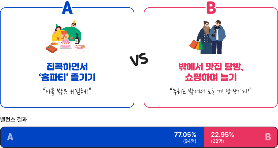 어느새 달력의 마지막 장을 맞이한 12월, 이맘때쯤 한 해를 돌이켜보면 ‘일상 속 작은 선택이 모여 오늘의 나를 만든 게 아닐까’ 하는 생각이 드는데요. 쏟아지는 모임, 미팅 속 있을 법한 여러 상황 속에서 여러분은 어떤 선택을 하실 건가요? 바쁜 연말연초, 가볍게 밸런스 게임 참가하면서 숨 한 번 고르는 시간 가지시길 바랍니다.