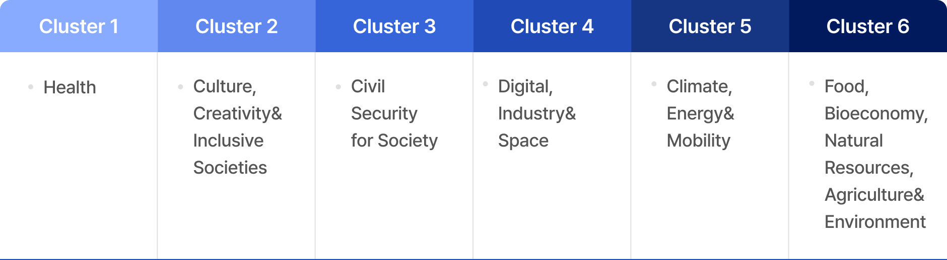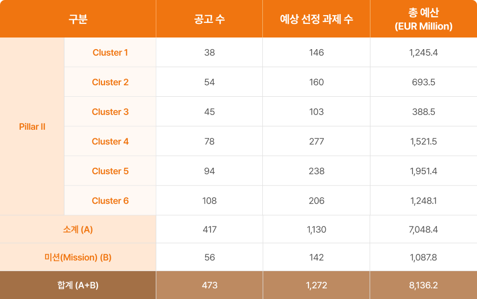 우리나라는 지난해 아시아 국가 최초로 호라이즌 유럽(Horizon Europe) 준회원국 자격을 얻으면서 Pillar Ⅱ 분야 과제에 참여할 수 있게 되었습니다. Pillar Ⅱ는 글로벌 문제 해결 및 산업 경쟁력 강화를 목표로, 6개의 하위 클러스트로 구성되어 있는데요.