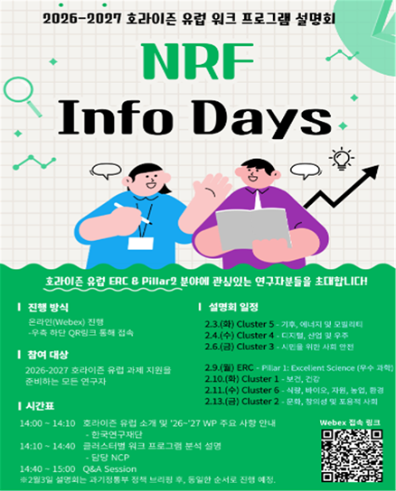 지난해 우리나라가 호라이즌 유럽(Horizon Europe) 준회원국 자격을 얻으며 국내 연구자들도 과제에 참여할 수 있게 되었지만 여전히 호라이즌 유럽(Horizon Europe)이 생소하고 어려운 분들이 많으신데요. 한국연구재단은 2026-2027 호라이즌 유럽(Horizon Europe) 과제 지원을 준비하는 연구자들을 위해 지난 2월 워크 프로그램 온라인 설명회인 NRF Info Days를 개최했습니다.