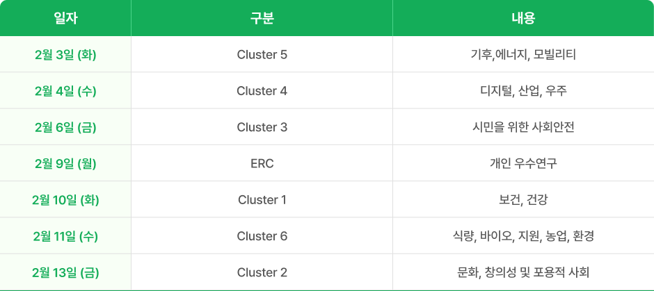 이번 설명회는 2월 3일부터 2월 13일까지, 클러스터별 담당 NCP를 통해 진행되었는데요. 호라이즌 유럽(Horizon Europe) 소개를 시작으로 2026-2027 워크 프로그램 변경사항, 클러스터별 워크 프로그램 분석 내용을 공유했습니다. 설명회 말미에는 Q&A Session을 마련해 궁금한 점을 묻고 답하며 소통하는 시간을 가졌습니다.