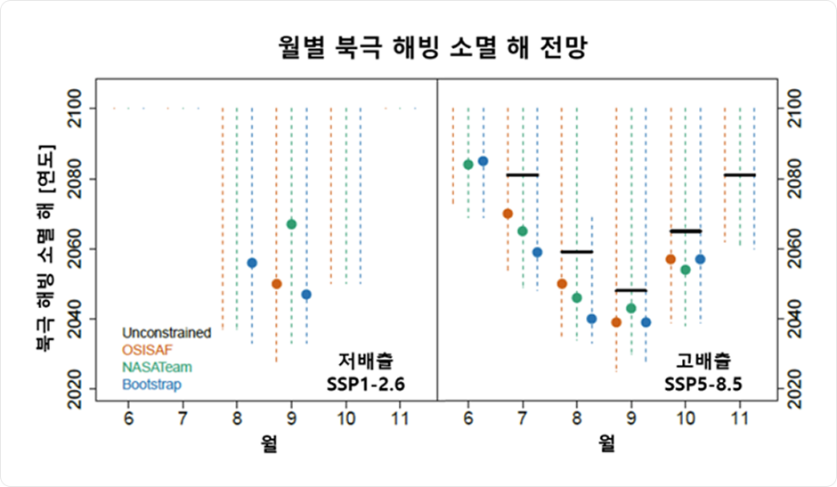 “관측된 기후변화의 원인에는 온실가스 이외에도 에어로졸, 태양 및 화산활동 등 다양한 요인이 작용할 수 있습니다. 기존의 관측-기후모델 비교 연구들은 과거 변화의 원인에 대한 정확한 규명이 충분하지 않아 한계가 있었어요. 반면 저희 연구에서는 과거 북극 해빙 감소의 대부분이 온실가스 증가 때문이라는 점을 먼저 확인했기 때문에, 미래 온실가스 배출에 따라 달라질 북극 해빙 변화를 보다 정확하게 수정해 줄 수 있었습니다.”