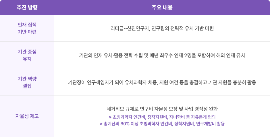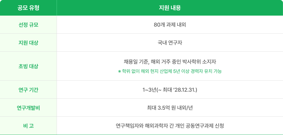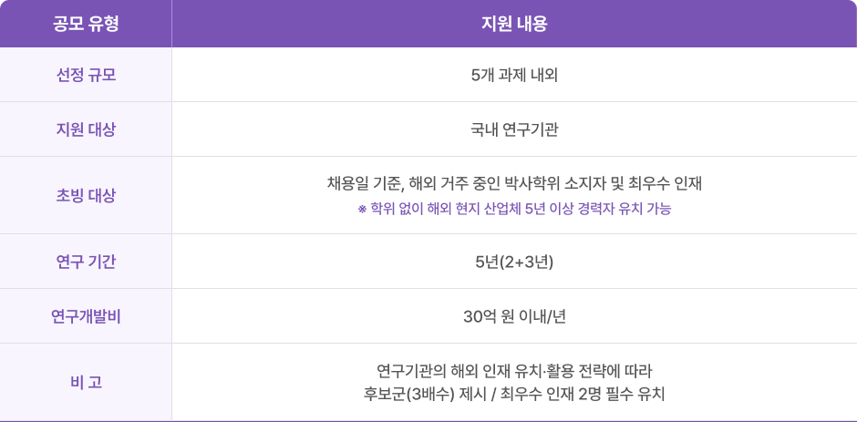 참여연구진은 보다 자율적으로 구성합니다. 다만, 신청 시 유치 전략에 따라 2인 이상의 최우수 인재를 포함해 필요한 해외 우수 과학자의 3배수를 후보군으로 제시해야 하죠. 아울러 선정된 이후에는 연구기간 동안 최소 2인 이상의 최우수 인재를 포함한 해외 우수 과학자를 유치하고 유지해야 하며, 이들은 매년 40% 이상 국내에 체류하며 공동연구를 수행해야 하는데요. 초빙 대상의 자격 요건은 채용일 기준 1년 이상 해외에 거주 중인 박사학위 소지자이거나 해외 현지 사업체에서 5년 이상 R&D 경력을 보유한 자로, 개인유치형과 동일합니다.