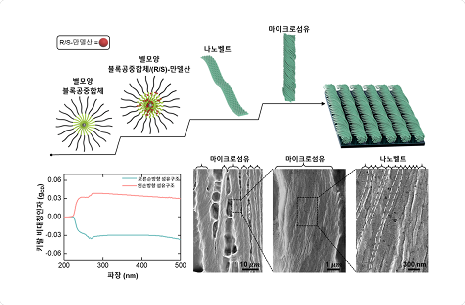 먼저 연구팀은 단분자 미셀을 형성하는 별 모양 블록 공중합체*를 조립 단위체로 도입했는데요. 이를 통해 외부 자극에도 구조적 안전성을 유지하는 키랄 초분자 시스템을 개발하기에 이르죠. 특히 R/S-만델산과 고분자 사슬 간의 다중 수소결합을 유도함으로써, 키랄 정보가 분자 수준에서 거시적 구조까지 정밀하게 전달·증폭되도록 설계했습니다. 특히 이번 연구는 오랜 기간 공동연구를 수행해 온 연구진과의 협업을 통해 일군 성과라 더욱 의미가 깊다고 하는데요. 2013년, 즈췬 린 교수 연구진은 별 모양의 양친성 블록 공중합체를 합성해 네이처 나노테크놀로지(Nature Nanotechnology)에 게재한 바 있습니다. 10년이 지난 2022년, 당시 박사과정을 밟고 있던 연구진이 별 모양 공중합체에 키랄성 분자를 도입했습니다. 이를 집짓기 블록처럼 활용해 구조체를 만들면 되겠다는 중요한 힌트를 얻었다고 하죠.